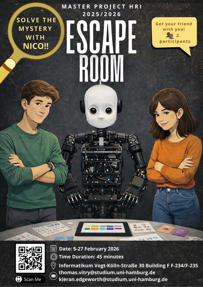 We currently have an Master HRI project called “Escape Room.” It is a 45-minute fun game designed for two people. You and your teammate will solve puzzles to escape, and our robot NICO will assist you throughout the game. The project will run until the end of February. You can register using the QR code on the poster or via this link. We look forward to your participation!
